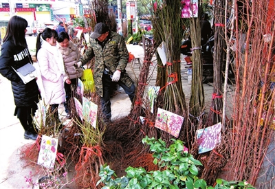 1日,正月初五,在崇阳县苗木市场,农民正在选购树苗。早春时节,该县苗木市场交易日渐升温,前来购买梨、桃、板栗等果树苗的农民络绎不绝。记者 袁灿 摄
