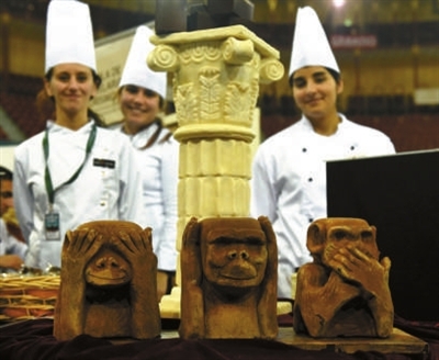 这是2月12日在葡萄牙里斯本巧克力节上拍摄的用巧克力制作的三只猴。