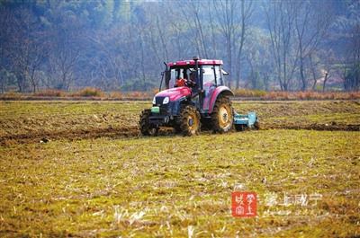 2月15日,大型旋耕机正在咸安区浮山办事处白鹤村15组的农田里翻耕。