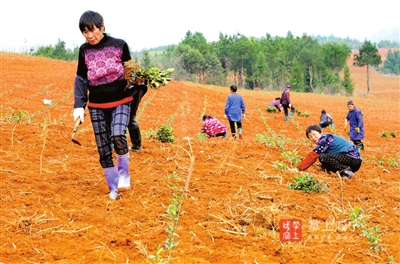 23日,崇阳县青山镇城万村小溪源家庭农场的白茶基地上,30多位村民正忙着移栽白茶苗。