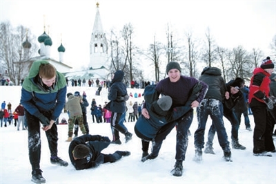 2月25日,在俄罗斯雅罗斯拉夫尔,人们在雪地里摔跤,庆祝“谢肉节”。“谢肉节”又称送冬节,俄罗斯各地民众在节日期间载歌载舞,做游戏、吃薄饼、烧稻草人,迎接春天的到来。 (据新华社)