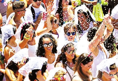 当地时间2月18日,许多民众聚集在巴西圣保罗的主要街道,参加一年一度狂欢节前的“和我结婚”游行,甚至还有不少女性身着婚纱参与到活动中来。