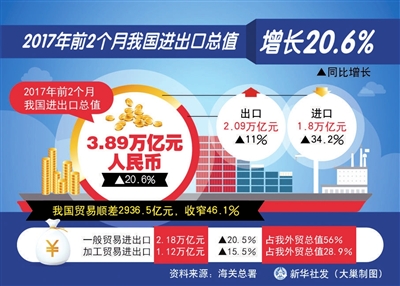 据新华社北京3月8日电 海关总署8日发布的数据显示,今年前2个月,我国进出口总值3.89万亿元人民币,同比增长20.6%。
