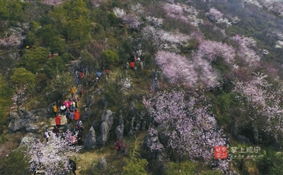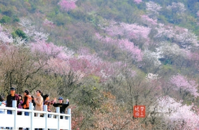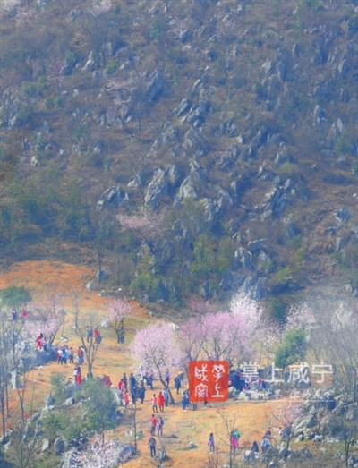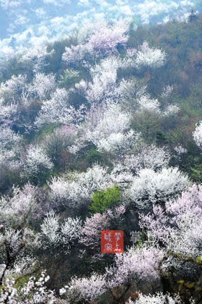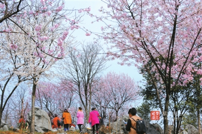 沿着山路往上走,从山腰间就可偶尔看到一两株盛开的野樱花,一簇簇地迎着乍暖还寒的风怒放。越往山顶走,樱花树越多,它们毫无规律地散落在路旁或山崖,虽树形略显杂乱,但细看每一个花枝却十分俏丽,白的、粉的花朵密密匝匝地开满枝头,清新淡雅,不惹一粒凡尘。顺着乱石园林走上山顶,极目远眺,漫山遍野的花儿定会让你如痴如醉。