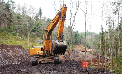 3月9日,记者在港口乡西庭岩山道上看到,通往铜钟大岭的循坏旅游公路正在热火朝天的施工,现场工人们正在为最后施工冲刺而努力。