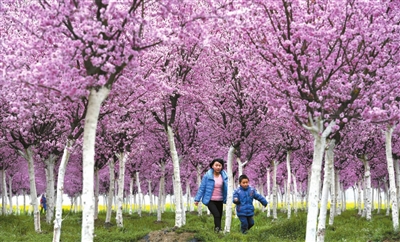 3月19日,两名小朋友在勉县天荡山下的梅花园赏梅。