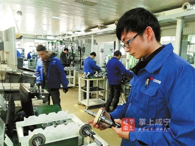 15日,咸宁高新区,湖北三环汽车方向机有限公司EPS总装车间员工陈刚正在进行涡轮与轴承压装。