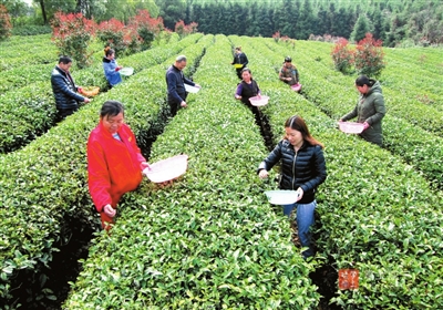 21日,咸安区贺胜桥镇黎首村茶场员工在采摘春茶。