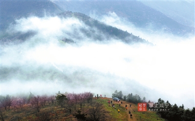 就这样痴迷在花事的遐想和镜头的捕捉里,不知不觉登上了海拔950多米的山顶。极目远眺,峰峦叠嶂,林木葱葱,云雾茫茫;山下道路,蜿蜒曲折,如同龙蛇穿行其间。高山雾重,猝不及防就有一道道“仙气”袅绕身旁,远近十多个山头的野樱花远看如云,近看似纱,宛若“仙女”下凡。好个山花烂漫的极致美景!