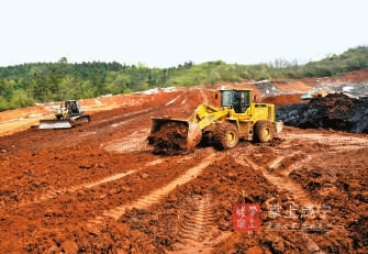 28日,嘉鱼县高铁岭镇高强锰业尾矿库,大型机械正在进行二号副坝施工作业。据了解,高强锰业2014年停产后,尾矿库存有80万立方米的锰渣不能有效管理和维护,存有较大的环保隐患。今年,该镇将之纳入突出环境问题整治清单,对渣库实行三级平台整形,并覆土植绿,建污水处理站对渗滤液进行处理,预计今年4月底可完工。