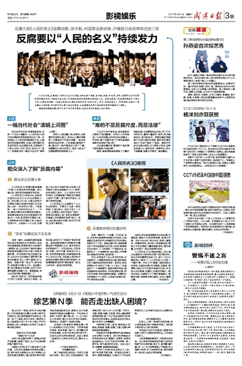 《人民的名义》还将陆续播出,观众通过此剧就可以感知到反腐斗争的复杂性。相比近年来霸屏的各类大IP,宫斗、玄幻大概把观众“看伤了”,《人民的名义》这样一个题材“硬”,并且几乎“裸播”(指拒绝购买收视率,且宣发低调)的反腐剧,在微信、微博等大型社交平台都引起强烈反响,可见观众对好剧情、好题材、好演员的需求。哪怕对政治、法律都不大了解的普通群众,看看张丰毅、侯勇等戏骨们飙戏,也可以看得过瘾。 (本报综合)