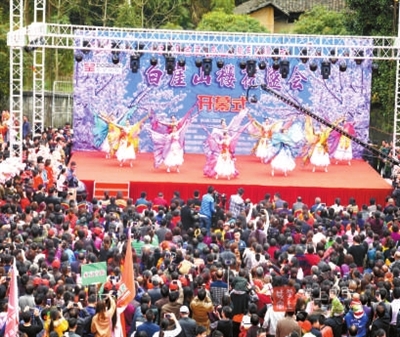 彩旗飘飘,山歌飞扬,樱花盛开,游人如织。当天的白崖山,游客来自省内外的四面八方,最老的年纪有74岁。当游客登山气馁时,导游领头唱起了山歌和红歌;当游客爬到半山腰时,当地村民利用天然的吹号石吹响号声鼓励游客继续前行,而山顶处,一股股流动的山泉水浸润着游客的心田……