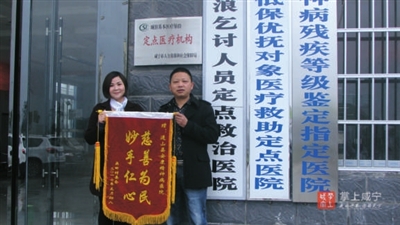 3月12日,通山县大路乡吴田村委会主任徐天禄(图右)为通山县安康精神病医院送去一面“慈善为民,妙手仁心”的大红锦旗。通山县安康精神病医院建在大路乡吴田村地段,院长石倩(图左)率领医院干部职工积极为患病困难户捐款,并为该村精准扶贫户、患病困难户来院治病减免医药费用。为此,村委会送面锦旗来感谢。
