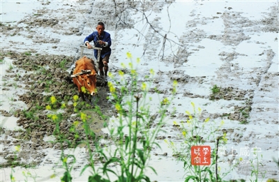 7日,通山县九宫山镇富有村农民罗文通在自家田地耕播中稻。清明后雨水充足,正是春播的好时节,广袤田野春意盎然,处处是忙碌的身影,播种春天的希望。 记者 张大乐 通讯员 徐辉 摄