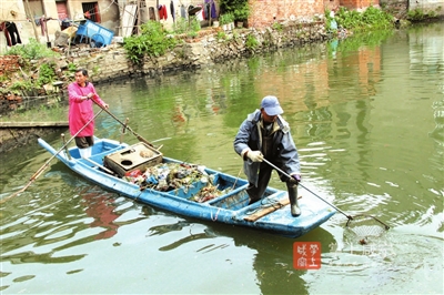 3月31日,嘉鱼三湖连江水库管理处的工作人员正在三湖连江公路桥水域打捞湖面漂浮的垃圾,并对湖岸旁的各类杂物进行清理拖运。