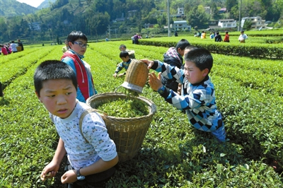 4月14日,湖北省宣恩县椒园镇龙井小学的孩子们利用“农忙假”,相约帮助劳动力缺乏的家庭采摘茶叶。