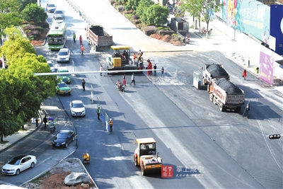14日,城区银泉大道与咸宁大道交叉路口,路面刷黑工程正紧张进行。