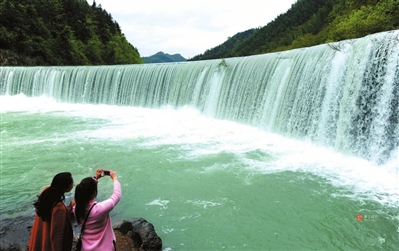 27日,一场春雨后,崇阳县金塘镇畈上村金塘河上拦水坝飞瀑直下,蔚为壮观。