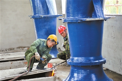 4月28日,赤壁市蒲圻办事处丰乐水库泵站,工人们正在安装大型水泵。