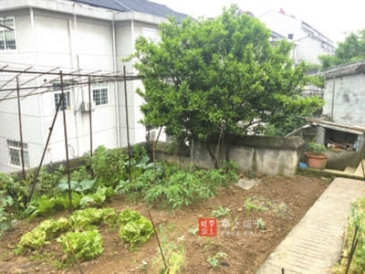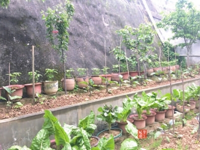 庭院里,整齐摆放的花草盆景,绿意盎然,竞相生长;楼顶上,一畦一畦的小菜地,满目翠绿,生长旺盛;墙角边的大花盆里,桃树上已挂满小果子,橘子花清新白嫩,散发着淡淡清香……