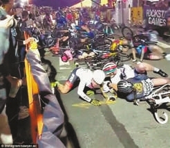 在视频中,比赛本来进行得十分顺利,但摔倒事故突然发生,后面的十几名选手连人带车都倒在了地上。围观群众惊呼之余,纷纷鼓励他们快点起来继续比赛。选手们互相问候各自的身体情况,随后便抬起车继续比赛。