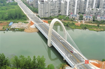 昨日,历时两年建设的全市首座斜拉式大桥——淦河大桥正式通车。该桥长144米,宽25米,双向四车道,将有效缓解城区交通压力。