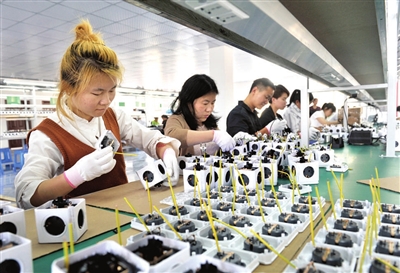 17日,咸安经济开发区温办凤凰科技孵化园,阿乐乐可湖北科技有限公司车间内,工人们正在操作台上组装魔方插座。