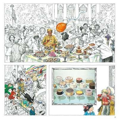 封面一位可爱的小姑娘拽着一颗黄气球,来到门庭若市的大都会博物馆门口的广场上。老奶奶和小姑娘兴高采烈,却被一个穿制服的管理员拦了下来,理由是不能带黄气球进入博物馆。小姑娘有点不舍,不过管理员给了个好建议,把气球绑在外面的栏杆上,由他帮忙照看。