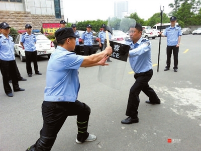 今年5月以来,崇阳县人民法院利用双休日组织全院14名保安人员不间断开展技能训练,切实提高了保安人员业务技能。图为进行技能训练的情景。