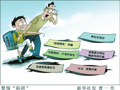 新华社成都6月11日电 每年高招录取期间,总有不法分子利用考生和家长急迫心情,设局诈骗。有关部门提醒家长谨防所谓“分不够,钱来凑”的虚假招生承诺,以及“内部指标”、虚假查分网址等诈骗手段。