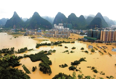 7月2日,广西融水苗族自治县县城部分地段被水淹没。