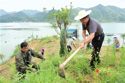 4日,富水湖畔,在通山县慈口乡茶园村一座孤岛上,县公共资源交易监督管理局员工正在清除杂草,让年初种植的红叶石楠、枇杷、松树等茁壮成长。