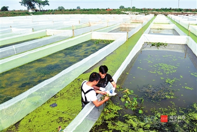 6日,嘉鱼县渡普镇东湖村水蛭养殖基地,基地负责人正在查看水蛭苗的长势。