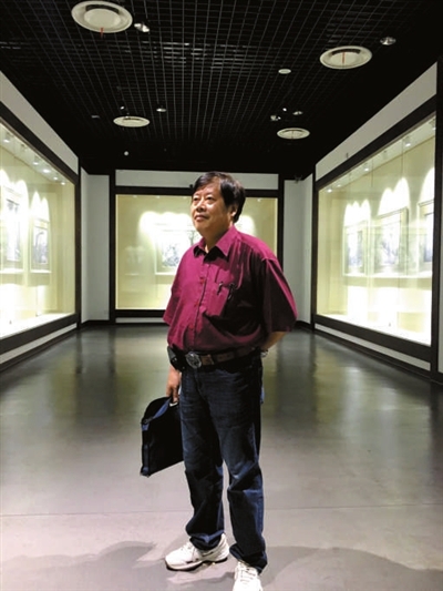 6月30日,在画展上,市民魏先生站立在作品《生命的探索》前不肯离去。许久之后,他请记者帮他和毛才奇在这幅画前合张影。