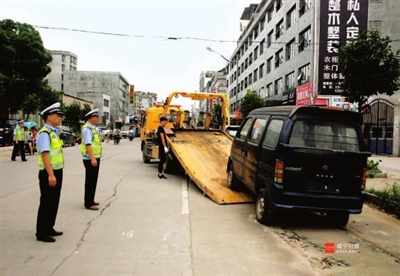 7月7日,记者随教导员何归富在崇阳四小至开发区路段,他正组织天城中队调来2台大型拖车,将停靠在路旁有碍观瞻、影响交通安全的“僵尸车”(废弃无人管的3台小车、1辆厚8轮大货车)全部拉走,受到了在场围观群众的拍手欢迎。