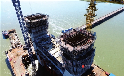 据了解,嘉鱼长江大桥是武汉城市圈环线高速公路重要控制性工程,大桥全长4660米,宽33.5米,主桥主跨920米,为目前世界最大跨径非对称混合梁斜拉索桥大桥。目前,长江水位下降,工程加紧施工,南岸主塔墩已完成高度70米。