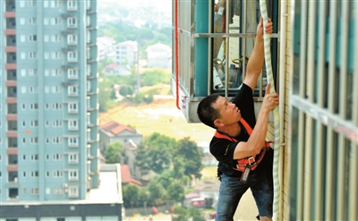 28日,气温39℃,桂泉花园小区16楼,格力空调安装工何山正在给居民安装空调。持续高温,空调进入销售旺季。在城区,有一群人战高温,冒酷暑,将炎热留给自己,把清凉送进万家,他们就是空调安装工,市民眼中的“清凉工程师”。(相关报道见今日4版)