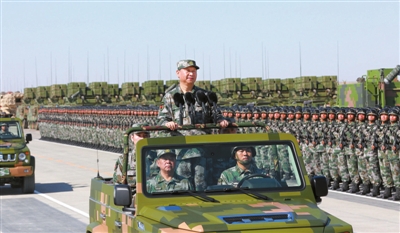 在激昂的阅兵曲声中,习近平乘车依次检阅护旗方队、人员方阵、装备方队。“同志们好!同志们辛苦了!”习近平向受阅部队表示亲切问候。“主席好!为人民服务!”官兵们的回答声震长空。习近平乘检阅车返回检阅台时,受阅官兵齐声高呼:“听党指挥、能打胜仗、作风优良。”铁阵如山,口号如潮。