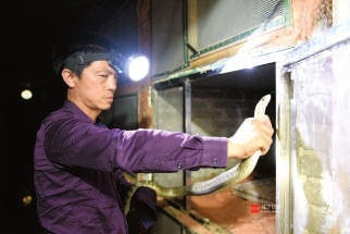 日前,记者在惠家蛇业园见到吴中海时,他他正在厂房里忙着给一条患皮肤病的大王蛇涂药,只见蛇吐着红红的信子,在他的手上缠来绕去,蛇头顺着脖子触及他脸颊,他不但不惊慌,还像摆弄玩具一样给蛇涂药。
