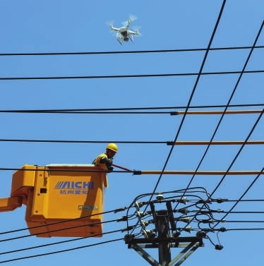 塔上的管涛正熟练地更换导线引流板,由于气温太高,衣服不透气,他已汗流浃背。地面的工作负责人不停向他喊话,通过交流判断管涛的身体和工作状况;无人机则盘旋在他头顶,实时监控安全作业。