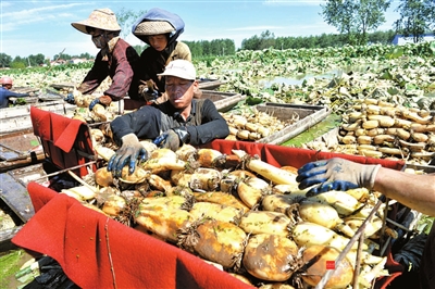 据了解,该基地近年来流转藕塘、界石、官洲等7个村的2500余亩土地,种植品质好、上市早、效益高的珍珠藕新品种,亩产1500多公斤,主要销往马来西亚、新加坡、加拿大等国,年产值达3000万元。