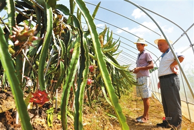 7月28日,通山县黄沙镇新庄村,贫困户阮士照和扶贫工作人员在产业园查看火龙果长势。