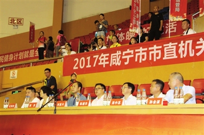 8月3日上午8:15,咸宁市金叶体育馆内群情激昂,“香约温泉”·咸宁市第九届“全民健身日”系列活动启动仪式暨“毛铺杯”2017年咸宁市直机关工间操比赛在庄严的国歌声中隆重开幕。标志着咸宁市第九届“全民健身日”系列活动正式拉开帷幕。咸宁市政府副秘书长陈建华主持开幕仪式,咸宁市政府副市长刘复兴宣布开幕。