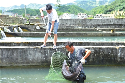7月31日,通山县黄沙铺镇的泉塘涌泉生态种养殖合作社,工作人员为客商打捞鲟鱼。