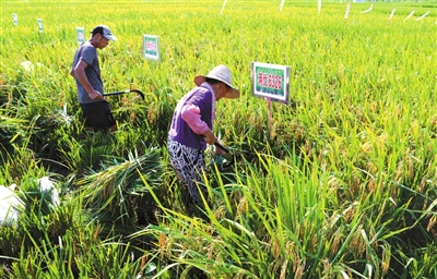 6日,位于咸安区向阳湖镇宝塔村的市农科院试验基地里,工人们用镰刀收割不同品种的再生稻。