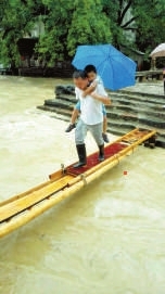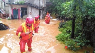 13日,崇阳县铜钟乡佛岭村三组横堤上,村民黄继育家办丧事,送葬的队伍回程的途中河水漫堤,在消防官兵救助下过河。