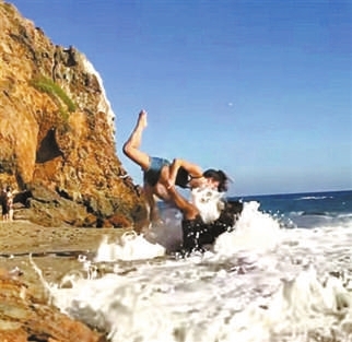 近日,一对情侣在海边展示一组浪漫的花式瑜伽动作,不料却被海浪冲倒,场面颇为搞笑。