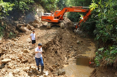 16日,天刚放晴,在咸安区汀泗桥镇赛丰村1组,数台挖机正在山里挥臂清理一被连日大雨引发的山洪冲毁的蓄水池。此水池是赛丰村1-5组共1300余人的用水水源,村里正在积极疏通建设,确保村民安全饮水。