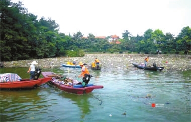 15日,天气刚放晴,市陆管委加派人手,组织大型清漂船、打捞船、机械设备及10艘小型清漂船,采取分类打捞、集中收集、转运的方式全力清漂。