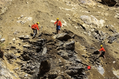 18日,施工人员正在对省道S208横路线K32+900处滑坡点清理浮土松石。 通讯员 吴涛 李沁摄
